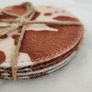 NWT Cowhide Coasters Tan Cream Plush 4.5" Spotted Cow Western Pattern. Set of 4. Smart. Stylish. Attractive. Protect your bar or living room surfaces in these Western & cowboy patterns in style! Black bottom. Brand new with tags! 3 sets available!