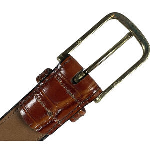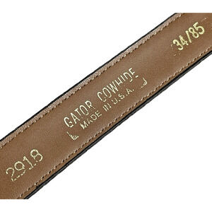 Cowhide Leather Gator Alligator Embossed Brown Womens Belt 35/85 #2918. Stamped "Gator Cowhide" on back, which means it is genuine leather that is embossed with an alligator skin pattern. Brass buckle and adjustable size 34/85 (should accommodate sizes 31-35 waist). Made in USA, likely the 1990s or earlier. Clean pre-owned EXCELLENT condition with no significant wear. Review photos carefully for all details.