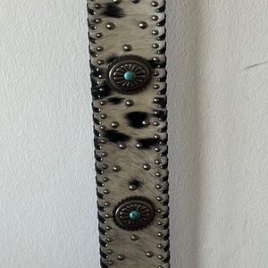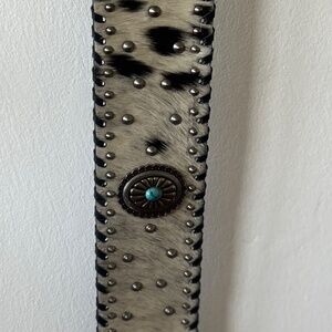 Genuine leather wide belts featuring cowhide, studded details, and turquoise conchos.