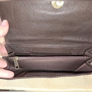 This elegant brown leather wallet features intricate floral detailing, perfect for adding a touch of sophistication to your accessories collection. Ideal for everyday use, it combines style and functionality. NEW.