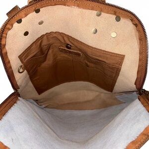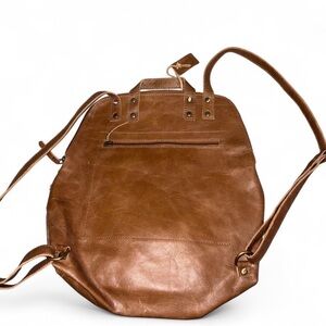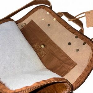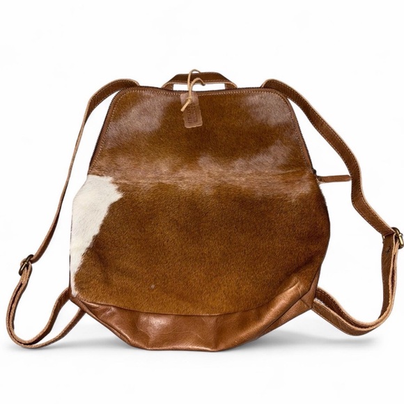 Stylish brown haircalf and leather backpack tote. Features a rich brown color with a natural white haircalf accent. Versatile carry options and durable leather trim for everyday use. Clean, modern design that complements casual and polished looks.
