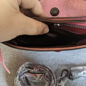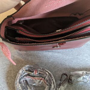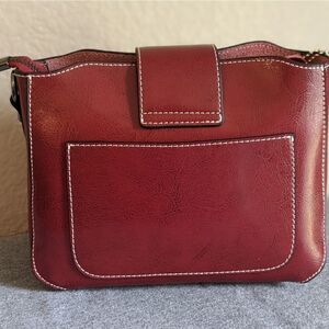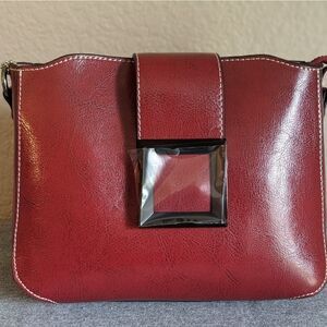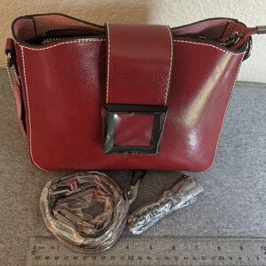 Cowhide Leather NWOT Hand Bag W/ Adjustable Strap. Wine Red, gorgeous bag, has 4 sections and a middle private zipper pouch. Strap on purse itself is magnetic.