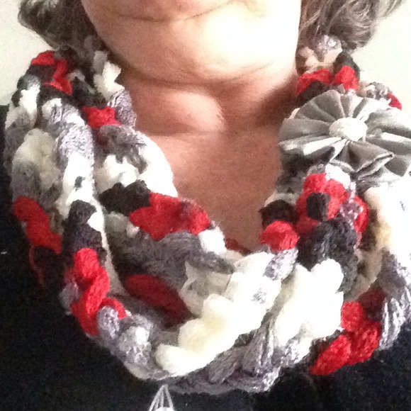 Braided gray, black,gray, and white cowl with a gray flower.