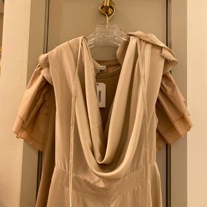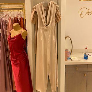 Beautiful tan jumpsuit in a silky material. Super cute roses on the shoulders and it has a cowl neck.