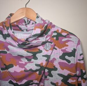 Keywords: cowl neck, sweatshirt, pullover, camouflage, camo, pink camo, green camo, casual, comfy, lounge wear, long sleeve, relaxed fit, womens sweatshirt, button detail, cozy