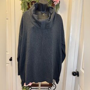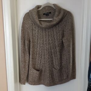 beautiful warm golden tan color sweater with cowl neck, pockets, and cable details.