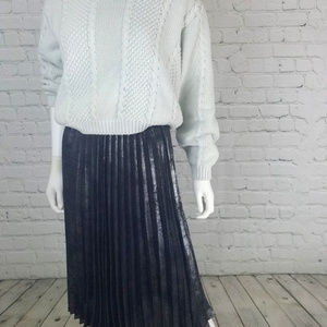 This is a cool white cowl-necked sweater by Wainscott. It is a heavy cable knit sweater, making it ideal for a cold day. It is a bit bulky around the bust area but comes in at the waist to cut a very nice figure. Good condition, no pulls, no stains.
