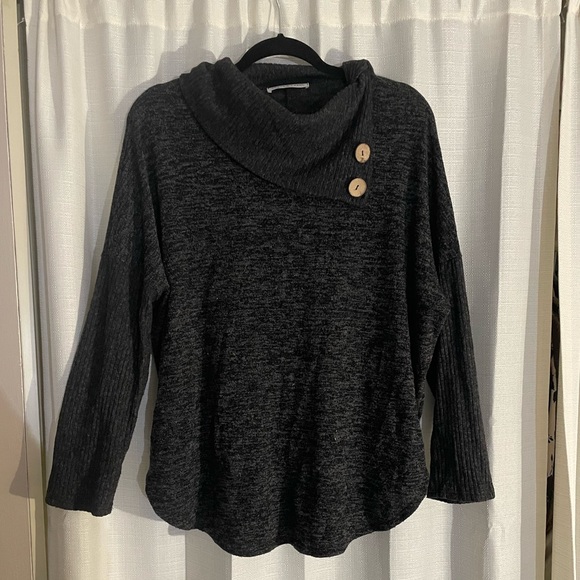 Charcoal grey cowl neck sweater with button design. Oversized fit
