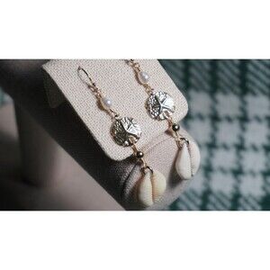 These Cowrie Earrings pair a textured gold charm with a natural shell drop on 14k gold fill hooks. Accented with a lustrous freshwater pearl, this design captures the ultimate boho beach style, making it a perfect tropical vacation gift or accessory for your next seaside escape.