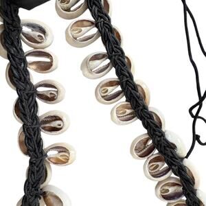 Handcrafted cowrie shell belt featuring natural white shells woven onto a black braided cord. Adjustable tie closure allows for multiple styling options — wear it low-rise, mid-waist, or as a boho accent over skirts, beach outfits, festival looks, or swim coverups. Lightweight and beachy with a rustic, handmade feel.