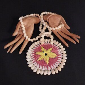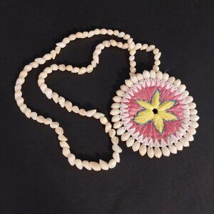 Cowrie Shell Lei Necklace With Floral Woven Pendant Medallion Pink Yellow