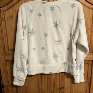 Great condition. Shorts have elastic and drawstring. Size L. Looks to be a small large. Shorts and long sleeve fleece set with snowflakes is so cute and cozy for the winter season. Measurements for top is 21 inches long and pit to pit 21 1/2. Shorts waist is 15 but stretchy. 13 long and inseam is 2 1/2.