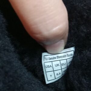 cozie steps black winter sheepskin boots, size 7, in good used condition. Some minor flaws on the front boot, and on one of the souls. looks like a rock was stuck there and made an indention. Other than that they feel and look just like uggs! so soft and warm.