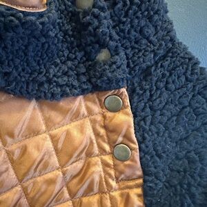 Warm pullover with quilted orange accents. Features a high collar and button detail. Perfect for chilly days.