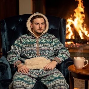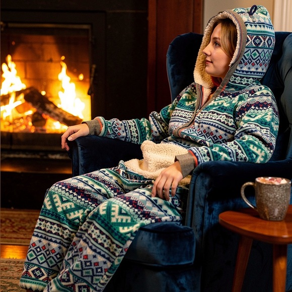 Stay warm and stylish with this cozy blue patterned hooded pajama set. Perfect for lounging by the fire.