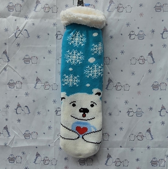 Stay warm and stylish with these cozy blue socks featuring a cute polar bear design. Perfect for adding a touch of fun to your winter wardrobe.