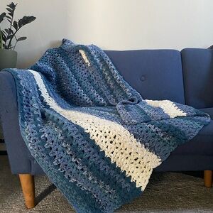 Soft crochet blanket in blue and white. 4.5feet by 4 feet. Perfect for adding warmth and style to any room.