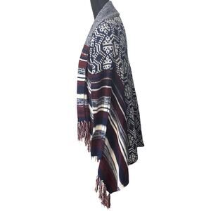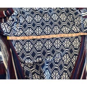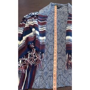 Cozy Boho Southwest Fringe Cardigan Sweater Open Front Waterfall Hem Blue Red Large