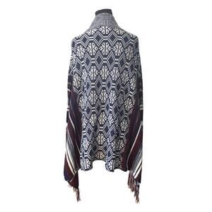 Beautiful longline open-front cardigan featuring a mixed knit design with bold navy, wine red, and ivory striping and a Nordic-inspired geometric pattern. Soft acrylic knit with a relaxed draped fit, waterfall hem, and fringe trim for a cozy boho/southwest vibe. Perfect layered for chilly weather, casual outfits, or cabin/holiday style.
