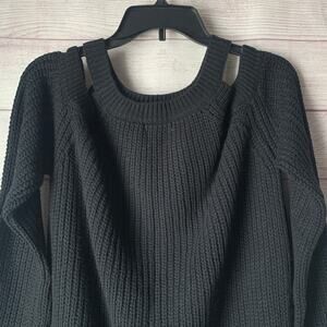 Black cold shoulder knit sweater by Cozy Casual. This sweater has a ribbed texture, a round neckline, long sleeves, and cold shoulder cutouts. It is pre-owned but in like-new condition. It fits a tad oversized or loose.