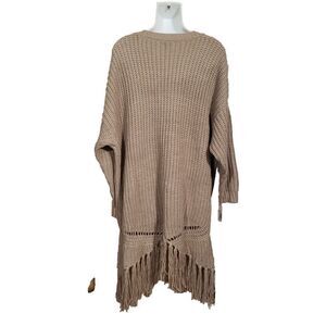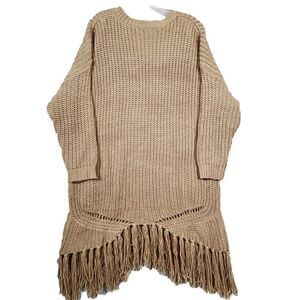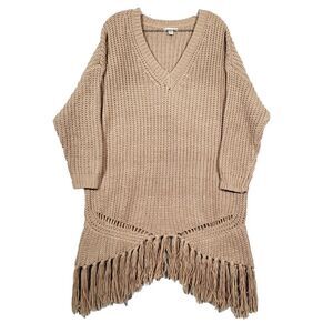 Cozy Casual Chunky Knit Sweater Womens Sz M/L Tan V Neck Fringe Boho Oversized