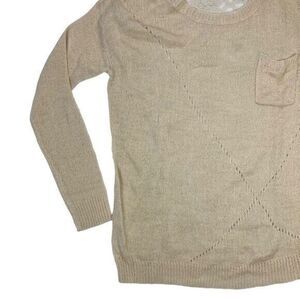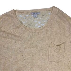 - Description: Cozy Casual Sweater Womens Sz S/M Tan Floral Pattern Lace Crew Neck Cottagecore
