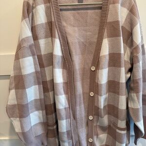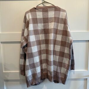 Stay warm and stylish with this cozy checkered cardigan. Featuring a classic brown/mauve and white pattern, it's perfect for layering in cooler weather. Good condition, some little wear on front in picture not super noticeable. Rue21+ brand. Size 1X. 50% Vicose, 29% Polyester, 21% Nylon.