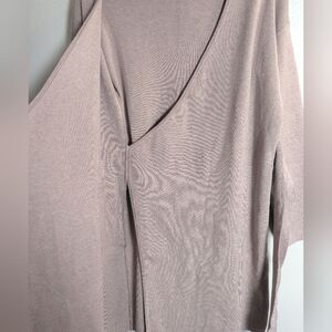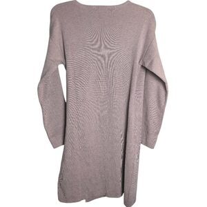 Stylish light mauvish pink soft very stretchy mini ribbed knit dress. Ideal for versatile wear as a short wrap dress or as a long duster sweater top. Attached inside seam, side tie closure. Measures 36" long, 20" flat across the bust, 22" flat across the hips. Viscose poly nylon blend