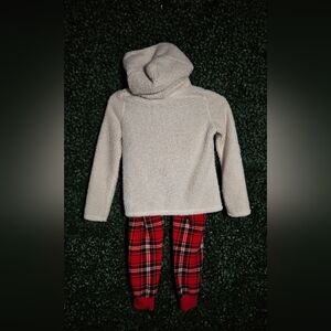 Soft cream hoodie with front pocket and red plaid pants. Perfect for comfort and style kids pajama set