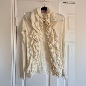Chic cream cardigan with cascading ruffles. Perfect for layering. Adds elegance to any look.