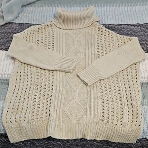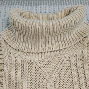 Stay warm and stylish with this cozy cream turtleneck sweater. Perfect for layering, this sweater offers both comfort and elegance. Size Medium. Worn once or twice. Very comfortable. Side slits. Warm but still light weight. Sleeves are skinny and fitted.