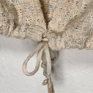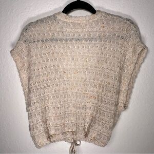 Add a touch of charm to your wardrobe with this Beldoch Popper open-front vest. Crafted in a textured knit with a speckled beige yarn, this sleeveless piece features cap sleeves, a draped open front, and a drawstring hem for an adjustable fit. No size tag, but fits like a Small — perfect for layering over tees or dresses.