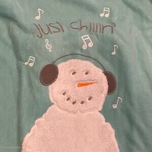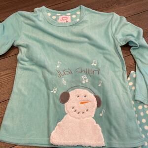 Stay warm and comfortable with this adorable Cozy Critters fleece pajama set in size medium. The light blue top features a whimsical snowman design with embroidered details, the words "Just Chillin'," and musical notes for a playful touch. Paired with matching polka dot fleece pants, this set is perfect for cozy nights and lazy mornings. Soft, lightweight, and gently used, this set is in excellent condition. Great for lounging or gifting!