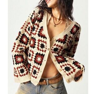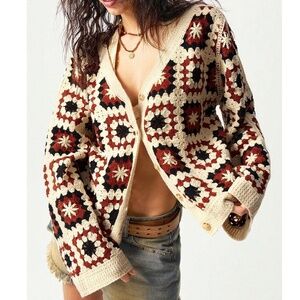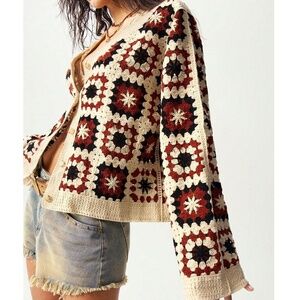 Cozy Crochet Patchwork Button Down Oversized Cardigan
