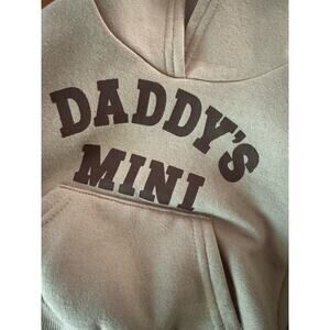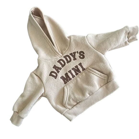 Cozy Cub Brown Daddy’s Mini Neutral Fleece Lined Pullover Hoodie. Adorable little pullover hoodie sweater shirt with “Daddy’s Mini” spelled across the front. Soft and warm fleece lining and kangaroo front pocket.
