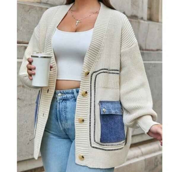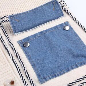 Cozy Denim Pockets Color Block Button Down Cardigan