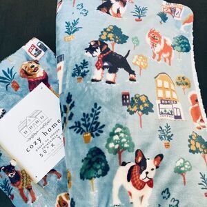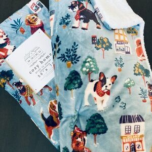 NWT cute blue botanical plant and dog print oversize plush throw blanket with white Sherpa reverse. Super soft, cozy and thick. 50”x70”.