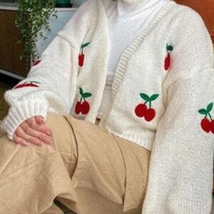 Cozy Embroidered Cherry Open Front Loose Fit Cardigan