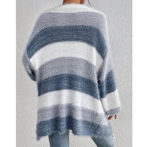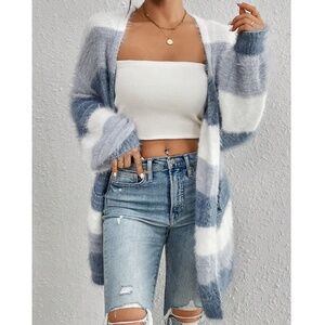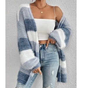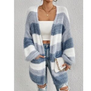 Cozy Fuzzy Color Block Open Front Pockets Loose Fit Cardigan