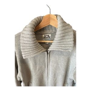 Embrace comfort and style with this cozy gray zip-up cardigan. Ideal for layering, it features a ribbed collar and cuffs for added warmth. Zipper is working but it takes a few to get going.