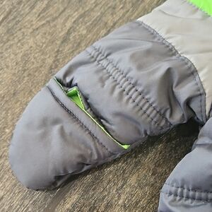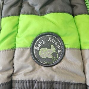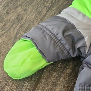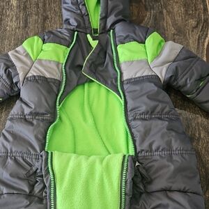 Ensure your baby stays snug and warm with this stylish gray and green snowsuit. Ideal for cold weather adventures.