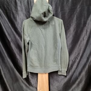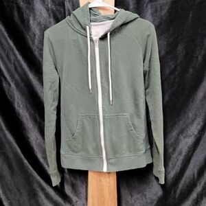 Comfortable green hoodie with a zip closure. Features a hood and front pockets. Perfect for casual outings.