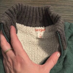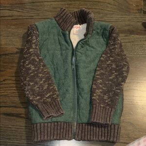 Warm knit jacket with a green body and brown patterned sleeves. Features a full zip front and ribbed cuffs. Perfect for chilly days.