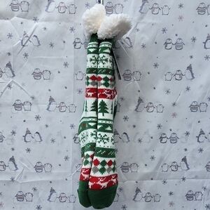 Add a festive touch to your home with this cozy holiday knit stocking. Featuring vibrant green and red accents, it's perfect for seasonal decor.
