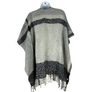 Warm and stylish poncho shawl, ideal for layering during cooler months. Features a fringe hem and a gray and black color pattern.