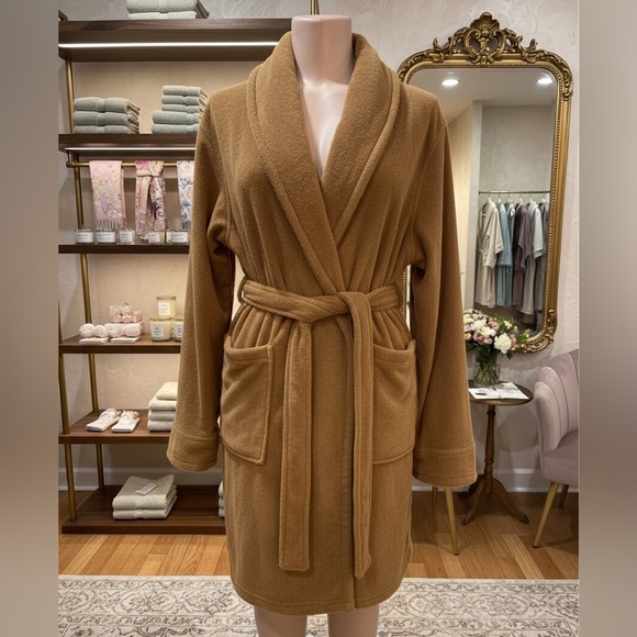Soft and plush robe in a soothing light green color. Perfect for lounging. The color looks more brown in person