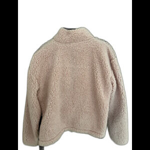 Stay warm with this cozy pink sherpa pullover. Features a half-zip design and a front pocket that zippers plus two side pockets. Wonderful condition and so cuddly.