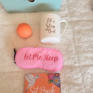 Enjoy a relaxing night with a mug, coloring book, sleep mask, and stress ball. Perfect for unwinding.