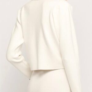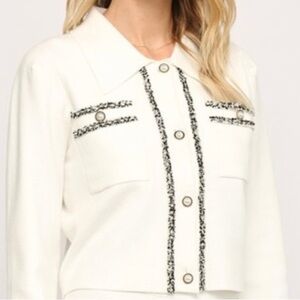 Elegant white jacket and skirt set. Features tweed trim and button details. Perfect for a chic, sophisticated look.