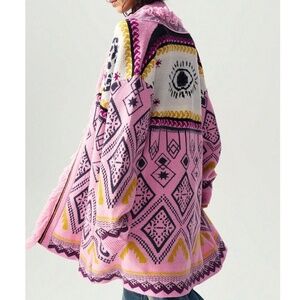 Cozy Pink Blessed Eye Geo Print Fringe Open Front Cardigan